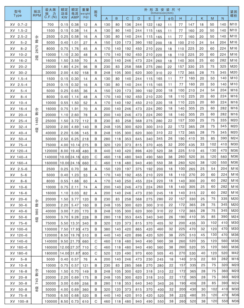 XV系列振動(dòng)電機(jī)技術(shù)參數(shù):